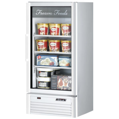 The Turbo Air TGF-10SDW-N glass merchandiser freezer uses algorithmic air circulation to optimize fan operation, boosting the compressor’s life by as much as 30 percent and saving 15 percent overall energy compared to similar units. It has eight cubic feet of space and three shelves, enabling it to hold a modest amount of product in point-of-sale applications. The door swings and has a glass panel that is triple-paned for reduced front thermal loss. A white interior highlights food items stocked in the Turbo Air TGF-10SD-N commercial freezer display case. LED lighting further showcases goods so customers can see them and potentially impulse shop. The bottom-mounted compressor works well in warm conditions, and its self-brushing condenser reduces dust and dirt buildup that is normal for standard bottom-mounted units. To protect stock after operating hours, the door has a lock.