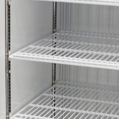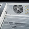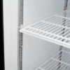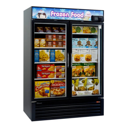 Eight 243/4-inch by 23-inch shelves are adjustable to accommodate a variety of product heights. Coated in polyethylene, the wire shelves are heavy duty and resistant to corrosion. To enhance the display, the interior is lit by LED lighting. The Turbo Air TGF-49FB-N two-section freezer merchandiser’s black exterior finish easily blends into different business types. An LED advertising panel helps increase impulse sales by attracting customers.