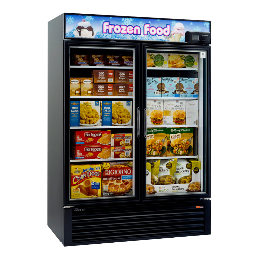 Freezer Merchandiser, two-section, 39.88 cu. ft., self-contained, (2) triple pane heated glass doors, LED lighting, (8) adjustable PE coated wire shelves, digital temperature controller, door opening alarm, self-diagnostic monitoring system, automatic fan motor delays, Turbo freezing, smart fuzzy defrosting, LED sign panel, solenoid valve, black exterior, bottom mount compressor, R290 Hydrocarbon refrigerant, 1 HP, 115v/60/1-ph, 9.8 amps, cord, NEMA 5-20P, cETLus, ETL-Sanitation