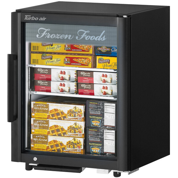 Built with a glass door, the Turbo Air TGF-5SDB-Nsuper deluxe glass merchandiser gives users a clear view of the interior, where products rest on two adjustable wire shelves. The shelves are coated with polyethylene to resist rust, and LED lighting brightens the inside of the cabinet to draw attention to displayed goods. Its automatic defrost function removes ice and frost with no user intervention, while fan control functionality reduces the burden on the compressor for an extended lifespan. The Turbo Air TGF-5SDB-N countertop refrigerator has a digital temperature monitoring system that minimizes fluctuations and maintains temperatures between -10 to 5 degrees Fahrenheit. To keep product secure, this unit can be locked, and it features self-diagnostic function to ensure that maintenance is performed as needed. Retaining cold air and reducing energy consumption, the cabinet is insulated with HCFC-free polyurethane foam.