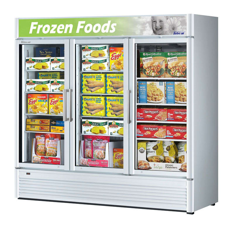 The Turbo Air TGF-72SD-N glass commercial display freezer uses its white chamber interiors and internal LED lighting to improve product presentation and hook customer attentions. Its 12 adjustable wire shelves and 60 cubic feet of space give staff options to organize items. The compressor is bottom mounted for efficiency in warm locations and its self-cleaning condenser takes care of dirt and dust buildup to reduce manual cleaning.