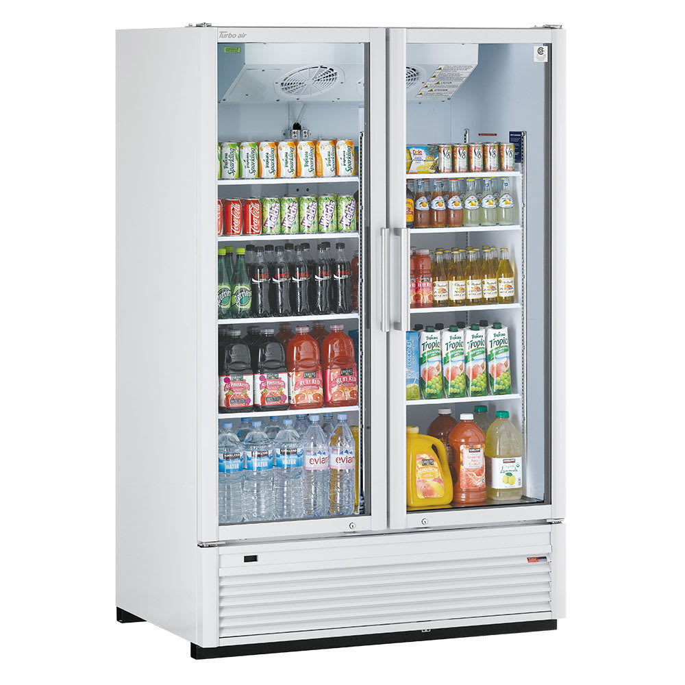 The Turbo Air TGM-47SD-N two-section glass door merchandiser has eight polyethylene-coated wire shelves that hold product. LED lights and two glass doors enhance visibility of product, as well as the white interior. Additional structure is provided by the foamed-in-place polyurethane insulation. Temperatures range from 33 to 38 degrees Fahrenheit and are maintained by R290 hydrocarbon refrigerant. A digital display shows the internal temperature, so it is easy to monitor. The Turbo Air TGM-47SD-N glass door merchandiser has an evaporator fan motor delay that turns the fan off when the doors are opened to prevent intake of warm air.