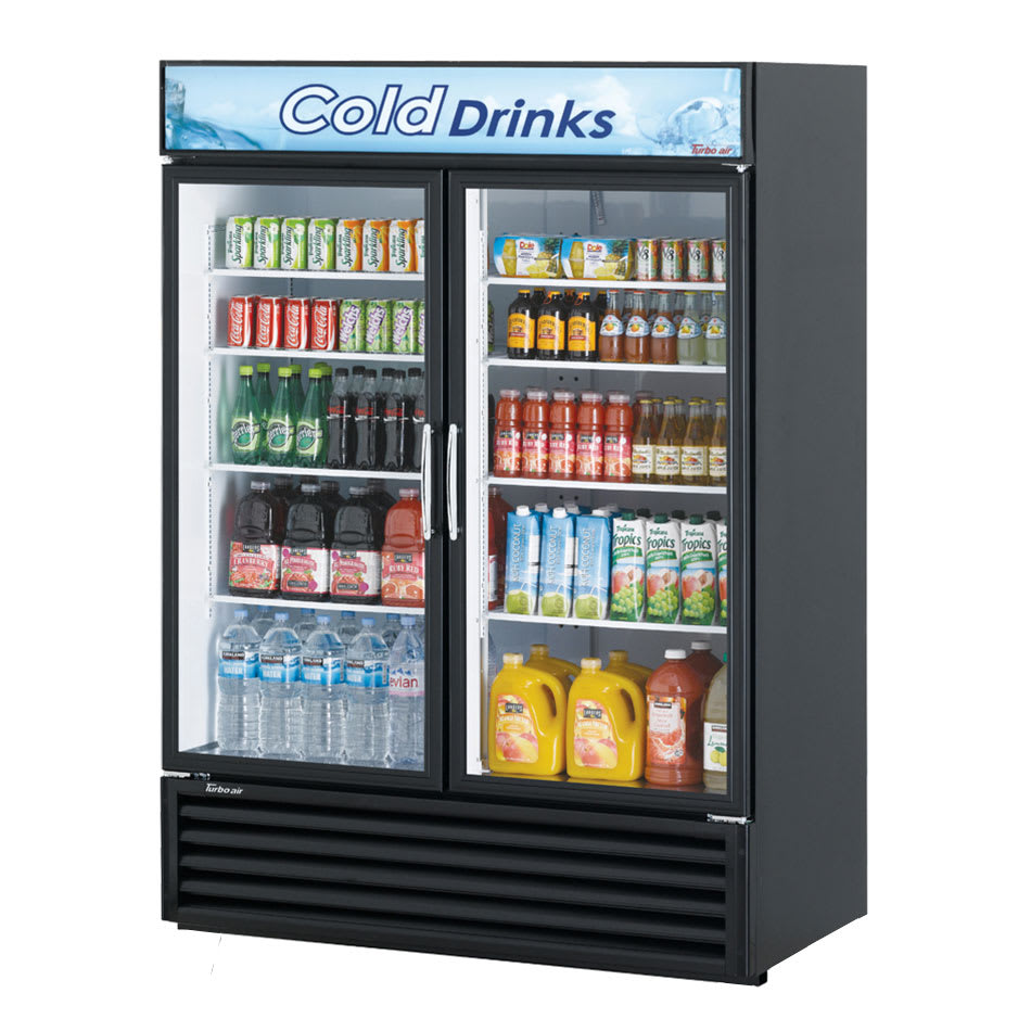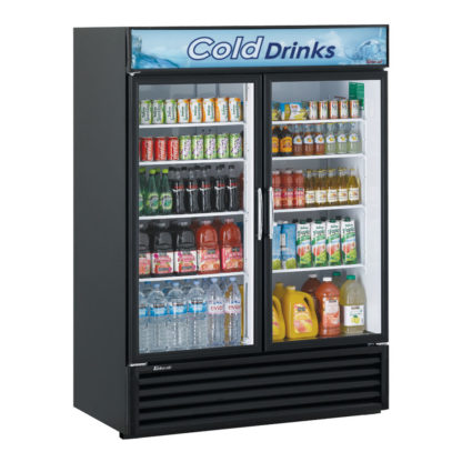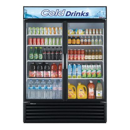 The Turbo Air TGM-50RSB-N two-section glass door merchandiser has a temperature range of 33 to 38 degrees Fahrenheit, maintaining a set temperature in that range with eco-friendly R290 hydrocarbon refrigerant. With its specially coated condensate system, the unit effectively minimizes corrosion and water overflow. There are eight polyethylene-coated shelves in the cabinet which are adjustable to suit the products being sold.