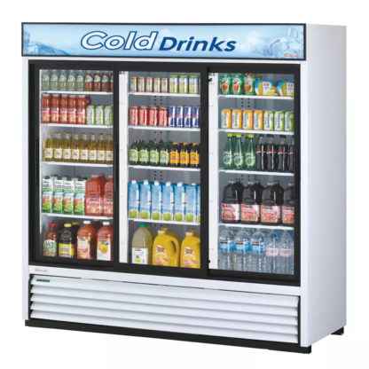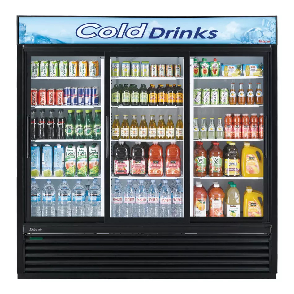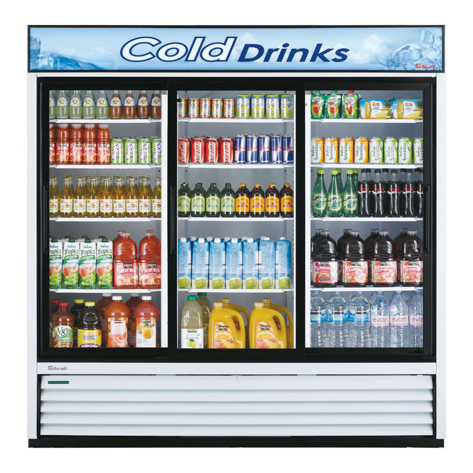 The Turbo Air TGM-69R-N three-section glass door merchandiser has a coated evaporator that resists corrosion. A hot gas condensate system has been treated to prevent condensate water overflow. Hydrocarbon refrigerant maintains a temperature range of 33 to 38 degrees Fahrenheit, and foamed-in-place polyurethane insulation keeps the cold air inside. LED interior lighting and three glass doors enhance visibility. The Turbo Air TGM-69R-N glass door merchandiser has 12 polyethylene-coated shelves where the product is stored.
