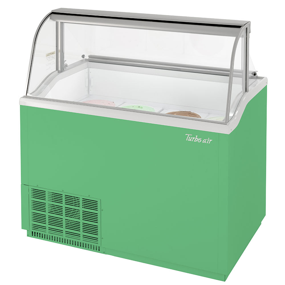 The Turbo Air TIDC-47G-N ice cream dipping cabinet has a cold wall system to keep temperatures consistent throughout the unit. It has two plastic night covers to keep product cold during slow hours and has a low-emissivity front glass to minimize heat transfer and energy consumption. It also has reinforced tempered glass on both sides with curved front and top glass to provide unit visibility. Two stainless steel shelves hold product, and the interior is illuminated with LED lighting. The Turbo Air TIDC-47G-N ice cream dipping cabinet has a green exterior to hold a total of twelve 3-gallon tubs. Extra storage space accommodates four ice cream tubs.