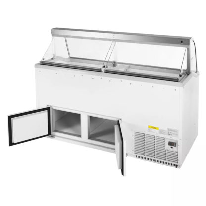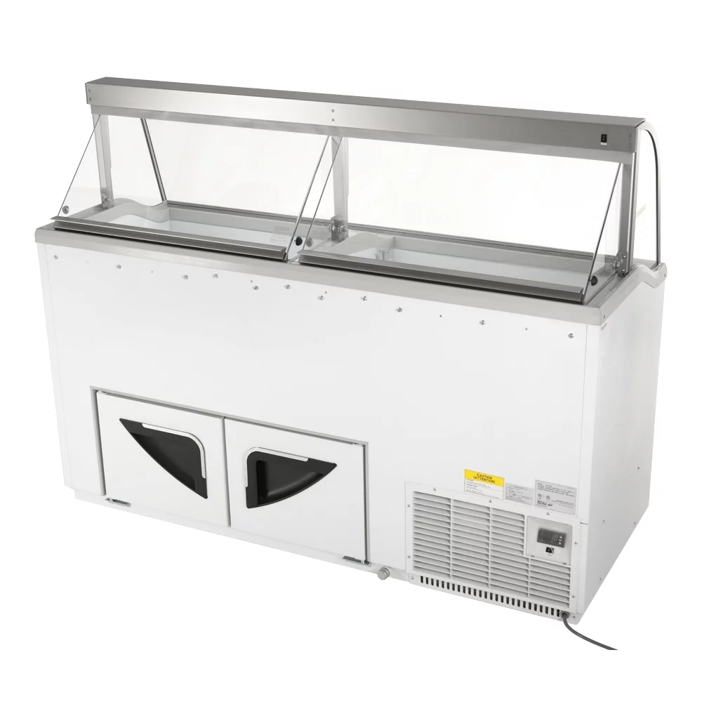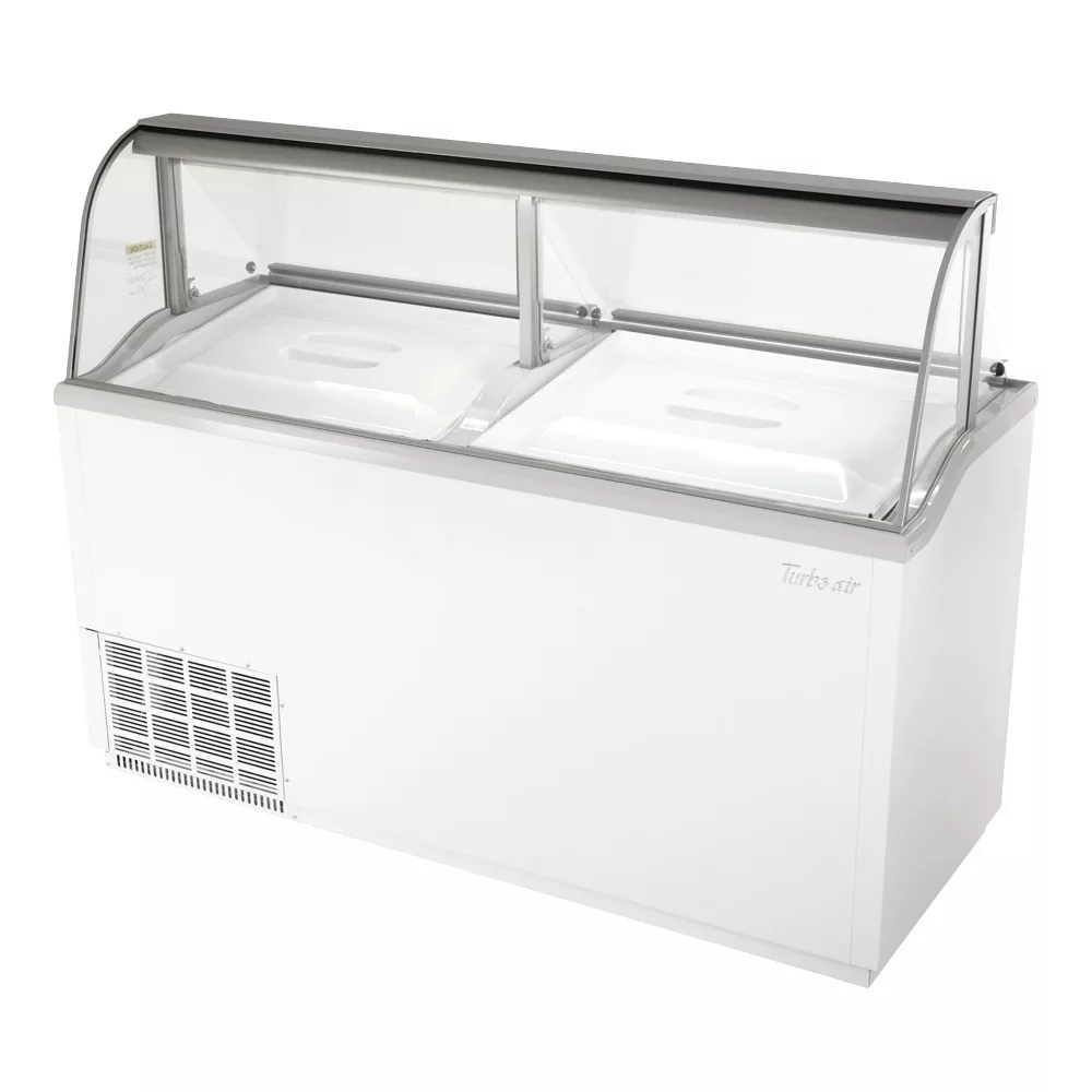 The Turbo Air TIDC-70W-N ice cream freezer holds (12) 3-gallon tubs of ice cream on display and eight tubs below for later use. Displayed flavors can be viewed through the front and side glass, and at the end of the night, two covers can be pulled down to keep the product safe. To enhance the display further, the interior has bright LED lights. The product is held on three shelves, which are made of stainless steel to provide durability.