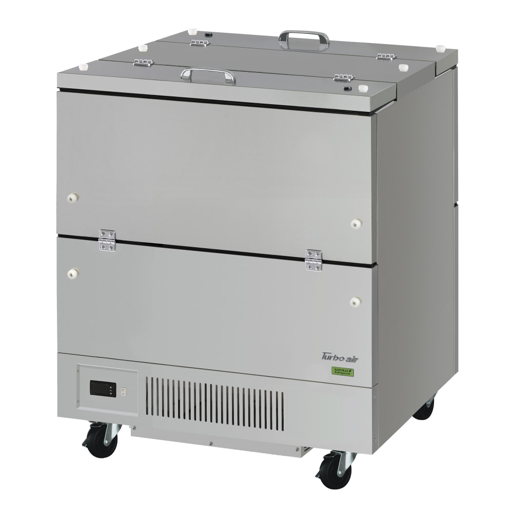 Super Deluxe Series Milk Cooler, cold wall, dual sided access, 34″W x 34-1/4″D x 40-5/8″H, 12.2 cu.ft capacity, accommodates (8) crates, exterior digital thermometer, temperature range 33° – 38°F, (2) drop locking doors with flip-up lid, (2) floor racks, stainless steel interior, stainless steel exterior finish, floor drain with hose adapter, 4″ swivel casters (2 locking), R600 Hydrocarbon refrigerant, 1/5 HP, 115v/60/1-ph, 7.0 amps, cord with NEMA 5-15P, cETLus, ETL-Sanitation, ENERGY STAR