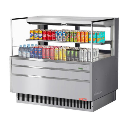 Horizontal Open Display Merchandiser, low-profile, 10.2 cu. ft. capacity, 46-3/4″W x 33-3/4″D x 44-1/4″H, self-contained refrigeration with self-cleaning condenser, tempered glass front shield & side panels, (1) shelf deck, sliding rear glass doors, digital electronic thermostat with defrost control, solar digital thermometer, LED interior lighting, stainless steel interior & exterior, includes night cover, front air intake & rear air discharge, R290 Hydrocarbon refrigerant, (2) 3/4 HP, 115v/60/1-ph, 13.6 amps, cord with NEMA 5-15P, cCSAus, CSA-Sanitation