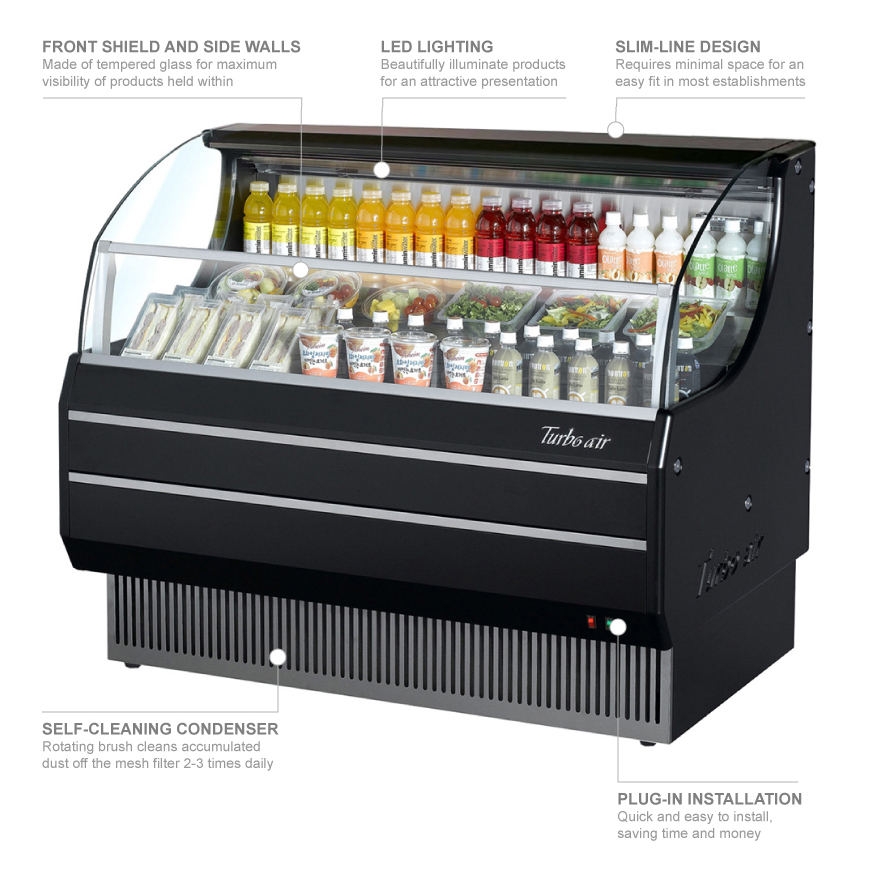 The Turbo Air TOM-60SW-N horizontal open-air cooler has three shelves for product storage. These shelves are made of stainless steel, so they can be wiped clean. Because the front is open, customers can view and grab products illuminated LED lights. To keep products from falling out of the display case, the tempered glass side walls and front shield secure them in place.