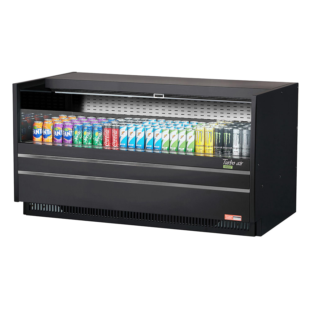 The Turbo Air TOM-60UC-B-N horizontal open-air cooler has a self-cleaning condenser that reduces the amount of maintenance needed. It keeps the cabinet cool with environmentally friendly R-290 hydrocarbon refrigerant. This unit is insulated with foamed-in-place polyurethane to retain chill and reduce the amount of energy used, saving money over time.