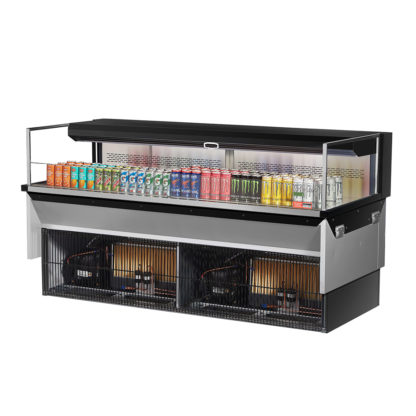 Drop-In Horizontal Open Display Case, low profile, 9.7 cu. ft. capacity, 71-7/8″W x 33″D x 37-3/4″H, self-contained refrigeration with self-cleaning condenser, deck only, tempered glass front shield & side walls, solar digital thermometer, digital electronic thermostat with defrost control, LED interior lighting, stainless steel interior, back wall & deck pan, specify exterior color, front air intake & rear air discharge, includes night cover, R290 Hydrocarbon refrigerant, (4) 3/4 HP, 220v/60/1ph, 13.0 amps, cord with NEMA 6-20P, CSA-Sanitation, cCSAus