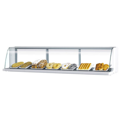 The Turbo Air TOM-75-L top display case has a glass front shield and side walls, providing product visibility while keeping contaminants out. Three doors make it easy for staff to access the displays. Constructed of stainless steel, the interior is durable and corrosion resistant. Blending into virtually any theme, the case has a white exterior. Designed to maximize the space on top of a TOM-75L or TOM-75S display case, the Turbo Air TOM-75-L top display case holds pastries and other baked products.