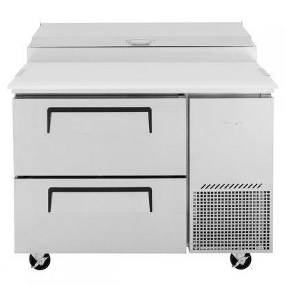 Thanks to its extra-deep 19 1/4″ cutting board, the Turbo Air TPR-44SD-D2-N 44″ two drawer pizza prep table provides plenty of space to build your signature pizzas, calzones, stromboli and more! Its topping rail accommodates (6) 1/3 size food pans up to 6″ deep to keep all your fresh toppings close at hand. A side-mounted, front-breathing 1/4 hp compressor that runs on eco-friendly R290 refrigerant. This specialized refrigerant has an ozone depletion potential (ODP) of 0 and a global warming potential (GWP) of 3, making it an environmentally-responsible choice for your business. The side-mounted compressor helps maintain food safe holding temperatures and lets the unit be placed closer to the wall than comparable models, saving precious aisle space.
