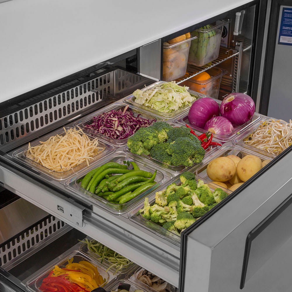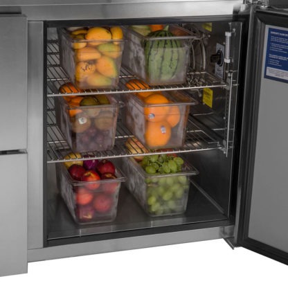 The prep area can hold nine third-size, 6-inch-deep pans, a set of which is included with the unit. Additional pans and other chilled items can be stored in an open compartment in the bottom of the Turbo Air TPR-67SD-D2-N pizza prep table. The unit also has two cold storage drawers that can each hold 12 sixth-size pans, allowing for quick refills of pans in the prep area or holding of additional ingredients. The interior, drawers, and two shelves in the door compartment are made of corrosion-resistant stainless steel. The self-contained refrigeration system uses R290 hydrocarbon refrigerant to maintain temperatures between 33 and 41 degrees Fahrenheit and is installed on the side of the unit to make service and maintenance easier.