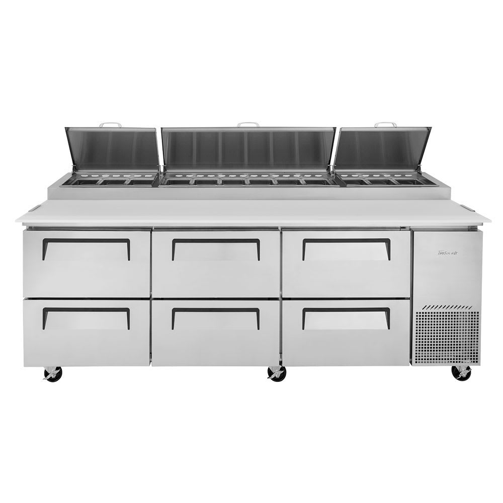 The Turbo Air TPR-93SD-D6-N three-section pizza prep table has a durable stainless steel construction. Its six drawers can hold 6-inch-deep, sixth-size pans, and the insulated pan cover on the top of the prep table can sit over (12) 6-inch-deep condiment pans. A 191/4-inch-deep by 1/2-inch-thick polyethylene cutting board can be used to prep ingredients. To ensure safety, the front 4-inch swivel casters lock.