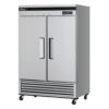 There are many innovative features available in this Turbo Air TSF-49SD-N two-section reach-in freezer, including the Turbo Freeze function. With this feature, the operator can activate a setting that enables the compressor to run for 2 hours for rapid cabinet cooling. When the door is opened, the automatic fan motor delay shuts the fan off, so it will not suck in ambient air. It also has a smart defrost system that activates only when defrosting is necessary, saving energy and keeping the stored product safe.