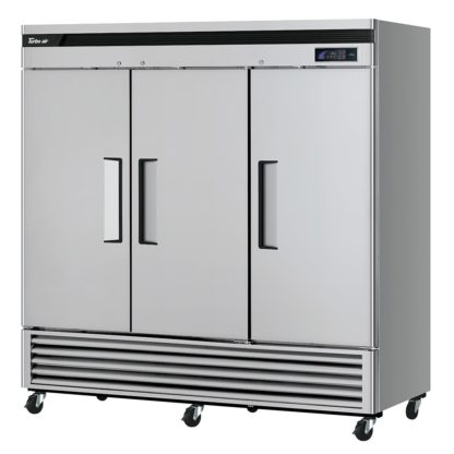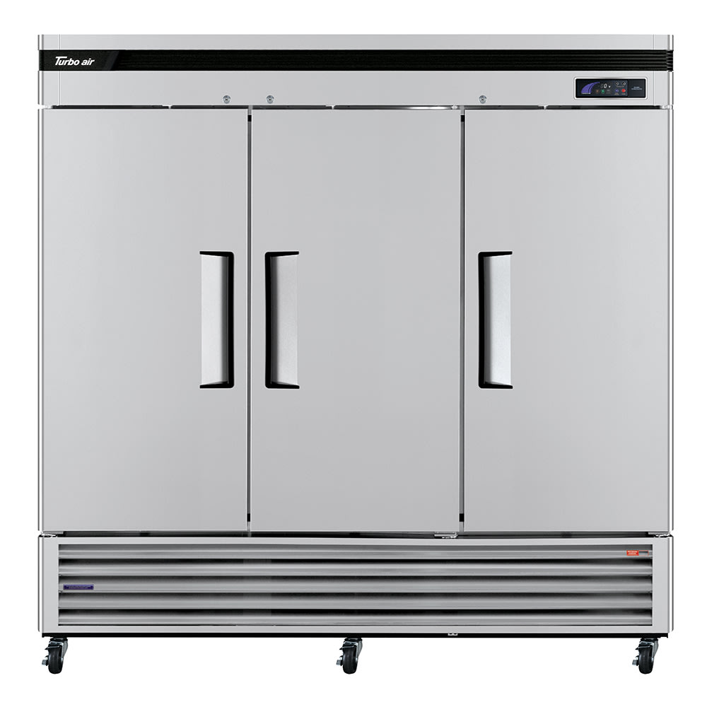 The Turbo Air TSF-72SD-N Super Deluxe three-section reach-in freezer uses a self-cleaning device to brush dust buildup from the condenser multiple times a day. The freezer is programmed to alert staff of potential problems before a system malfunction occurs, and the self-diagnosis program identifies any issues. With the Turbo Freeze function, the compressor can run for two hours straight, rapidly cooling the interior. Smart defrosting provides defrosting as needed. The compressor is mounted on the bottom of the unit for servicing.