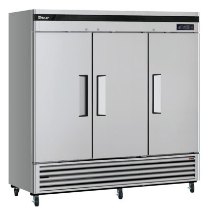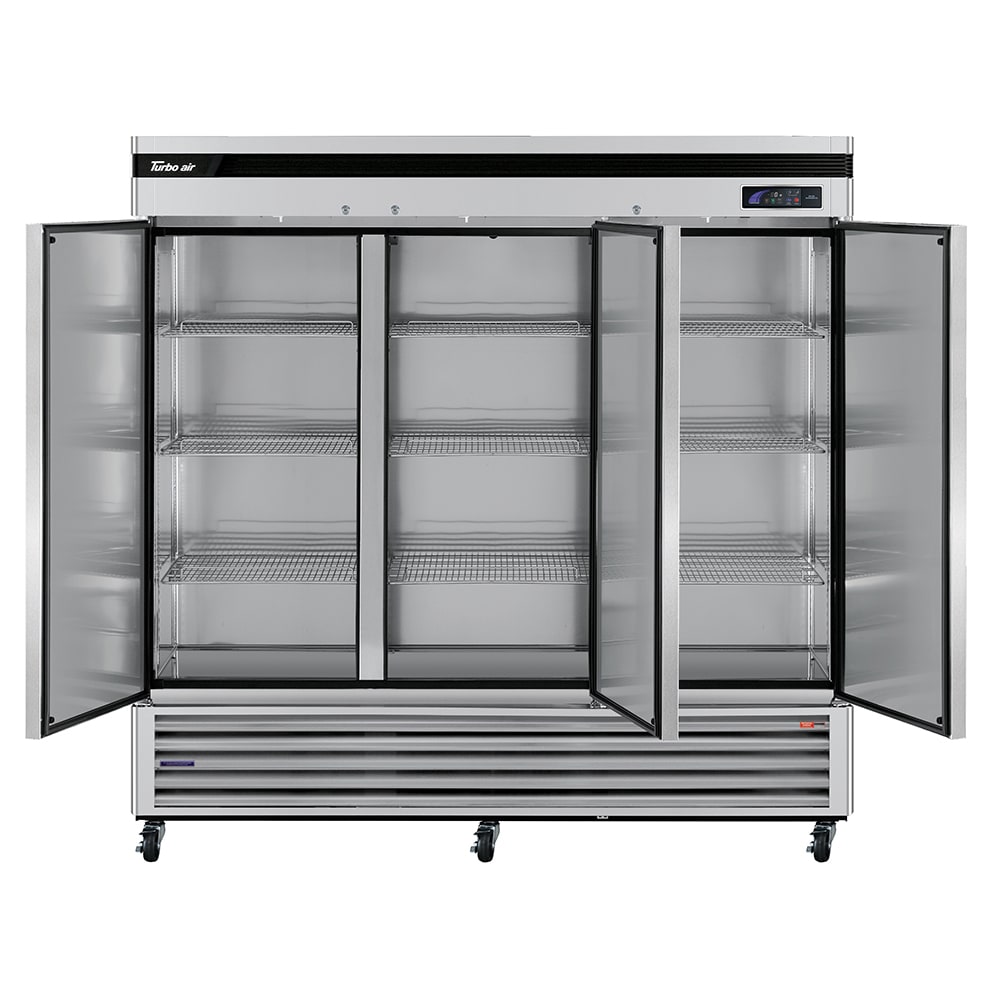 The Turbo Air TSF-72SD-N Super Deluxe three-section reach-in freezer has a stainless steel exterior, providing durability and resisting corrosion. The nine 241/2-inch-by-231/2-inch shelves are also made of stainless steel to simplify cleanup. Interior LED lighting enables users to easily see the stored contents. Three swing doors use a pressure relief design to eliminate vacuum pressure when opening. An alarm sounds to notify the operator when the doors are not sealed properly, preventing the loss of cold air that can lead to food spoilage. Insulated with high-density, foamed-in-place polyurethane, the freezer maintains temperatures between -10 and 0 degrees Fahrenheit, and a digital display enables the user to monitor internal temperatures.