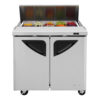 The Turbo Air TST-36SD-N6 prep table has a self-contained refrigeration system with a coated evaporator. Temperatures are digitally displayed on the digital controller, ranging from 33 to 39 degrees Fahrenheit. Its condenser has a device that removes dirt and dust, preventing premature system failure. In the top compartment, a forced-air system pushes cold air around product stored in pans, ensuring they stay in the food safe zone.