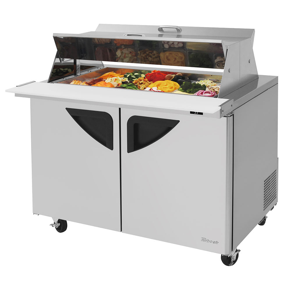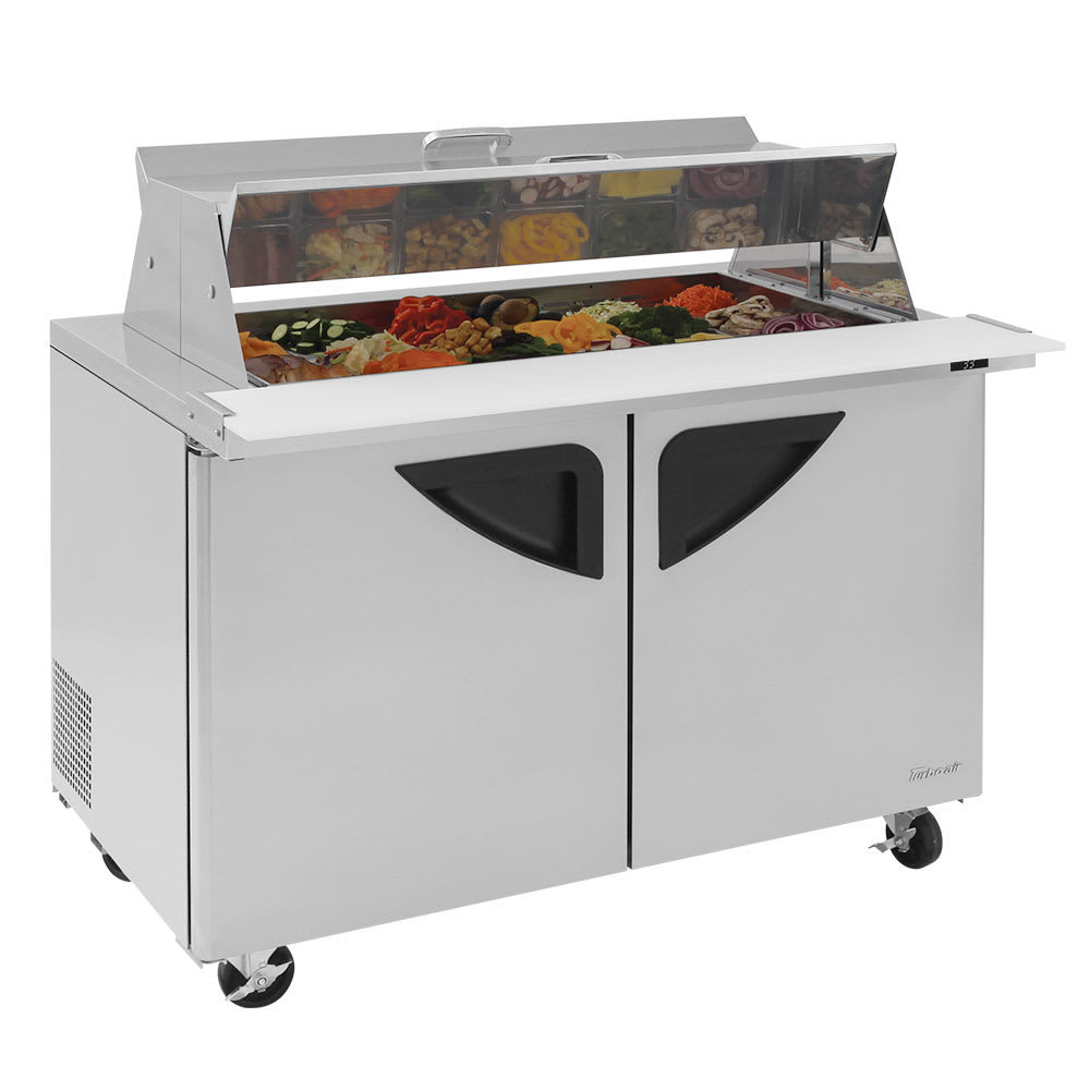With its stainless steel construction, the Turbo Air TST-48SD-18-N-DS Super Deluxe food prep table resists dents, scratches, and rust. It is insulated with high-density polyurethane foam for structure and temperature retention, and its refrigerated bottom holds contents between 33 and 39 degrees Fahrenheit. This unit comes with (18) 4-inch-deep, sixth-size food pans and recessed handles that provide a comfortable grip when opening. When the door is open, the fan stops to prevent hot air from getting sucked into the cabinet. Two stainless steel shelves in the cabinet can hold extra product.