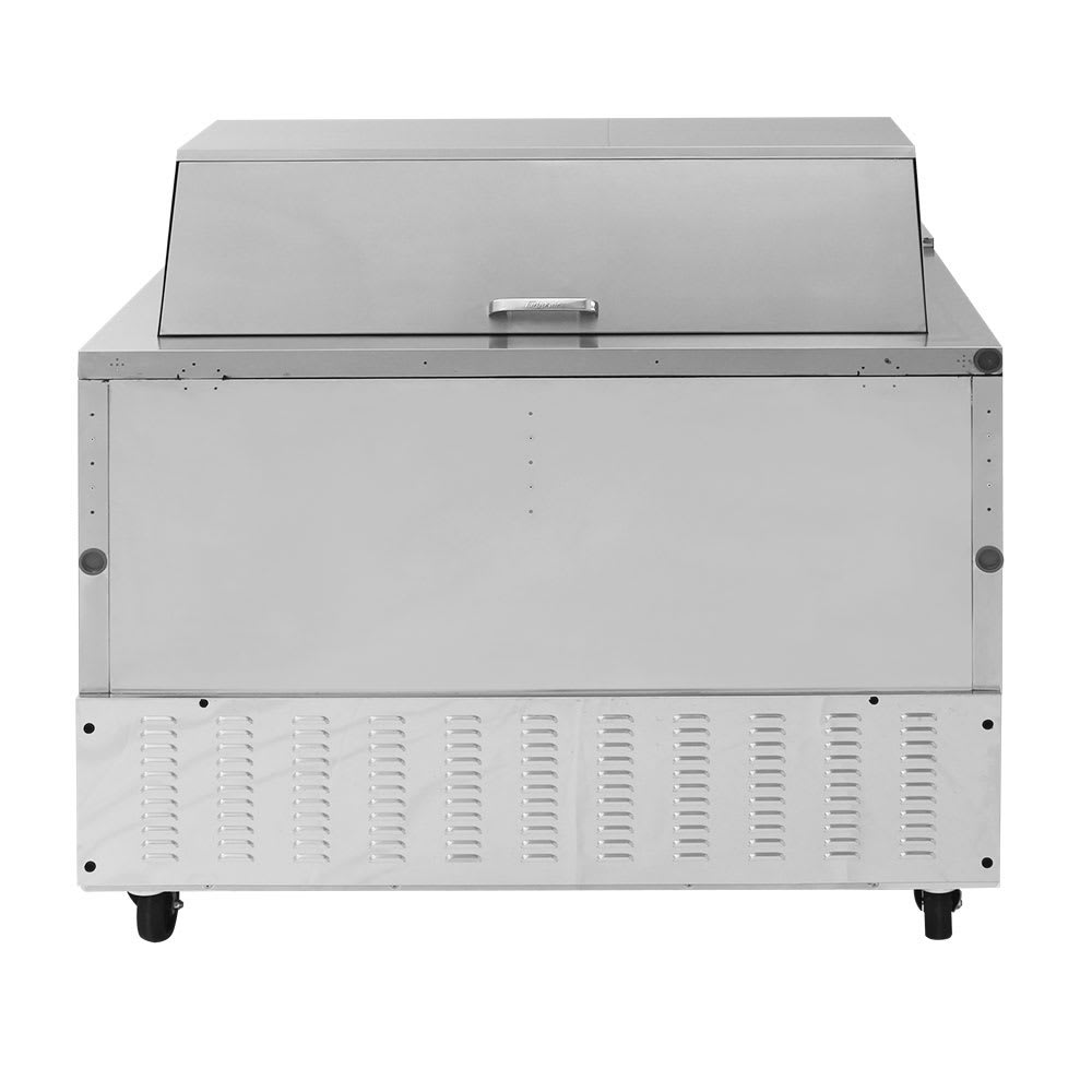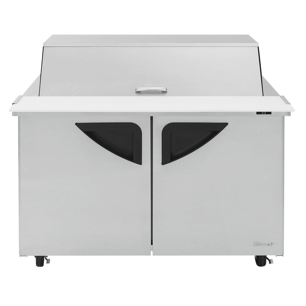 The Turbo Air TST-48SD-18-N-DS food prep table has a dual-sided, insulated lid that enables food preparation from both sides of the unit. For mobility, 4-inch-diameter swivel casters with front brakes are included. A Cold Bunker system continuously moves air around the food pans, keeping the top storage compartment at or under 41 degrees Fahrenheit. The interior is illuminated by LED lighting. A 91/2-inch-wide cutting board made of polyethylene provides space for prepping sandwiches and salads. Its condenser brushes itself daily to reduce dust and debris and prolong the unit’s life.