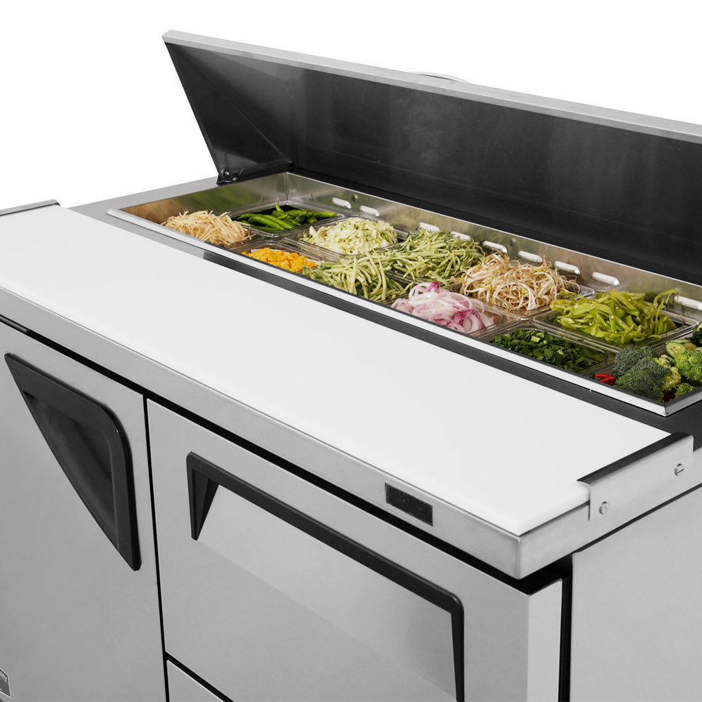 The Turbo Air TST-48SD-D2-N prep table’s stainless steel interior and exterior resist rust, dents, and scratches. In the top section, 12 sixth-size, 4-inch-deep pans hold ingredients for salads and sandwiches, which can be assembled on the serving line. The pans are cooled by a forced-air system that moves cold air around the pans to ensure the temperature does not exceed 41 degrees Fahrenheit. Additional products can be stored in the base, which is made up of two drawers and a door with a stainless steel shelf. Swivel casters enable this Turbo Air TST-48SD-D2-N prep table to be moved for cleaning and servicing.