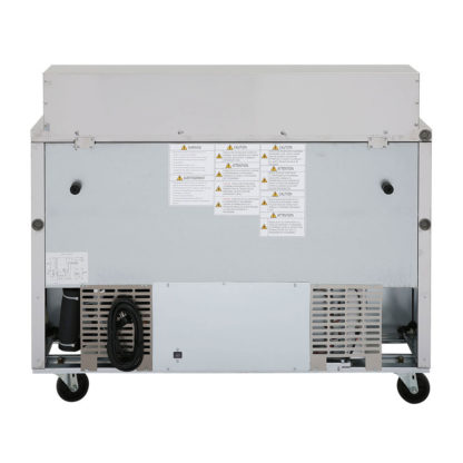 To keep product in the cutout under 41 degrees, the forced air system pushes cold air around the pans when the lid is open. Cool temperatures are maintained by R290 hydrocarbon refrigerant. Since the refrigeration system is self-contained, all the components are built together, making it easy to access. The Turbo Air TST-48SD-N prep table has a self-cleaning condenser that removes dirt and debris every day to keep the system from overheating.