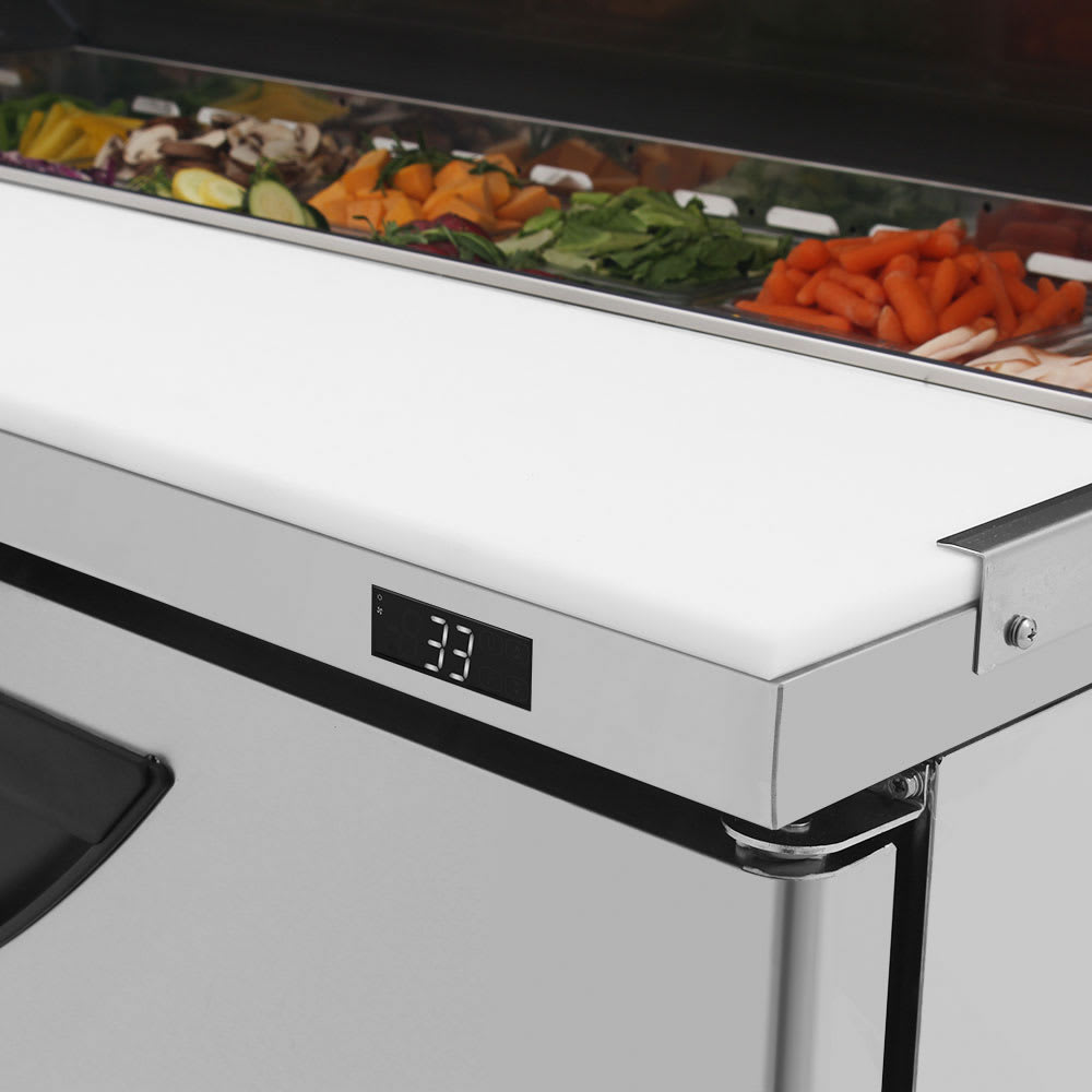 The Turbo Air TST-48SD-N prep table has a cutout that holds 12 sixth-size, 4-inch-deep pans, which are ideal for holding toppings for salads and sandwiches. Ingredients and main dishes alike can be prepared on the polyethylene cutting board that runs the length of the cabinet. An insulated pan cover sits over product to keep cold air around the pans. Two stainless steel shelves in the cabinet are heavy duty and resistant to corrosion. The interior and exterior are mostly constructed of stainless steel for durability.