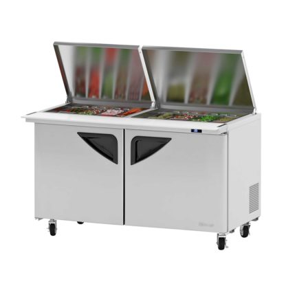 To ensure a long lifespan of heavy use, the Turbo Air TST-60SD-24-N-FL refrigerated prep table’s exterior and interior are constructed of corrosion-resistant stainless steel. It provides 19 cubic feet of interior space between its two sections and includes stainless steel wire shelves to streamline cleaning. Using eco-friendly R290 hydrocarbon refrigerant, this unit maintains temperatures between 33 and 38 degrees.