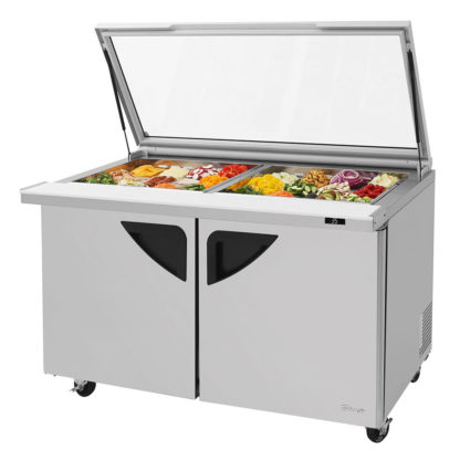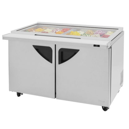 To prolong its life, the Turbo Air TST-60SD-24-N-GL Super Deluxe prep table has a self-cleaning condenser that brushes away debris and dust every day. Its heavy-duty stainless steel construction is scratch and rust resistant, and a removable 91/2-inch-wide polyethylene cutting board is included. When the door is opened, the fans turn off to save energy and prevent warm air from entering. To keep product under 41 degrees Fahrenheit, a Cold Bunker system moves air around and over the food pans.
