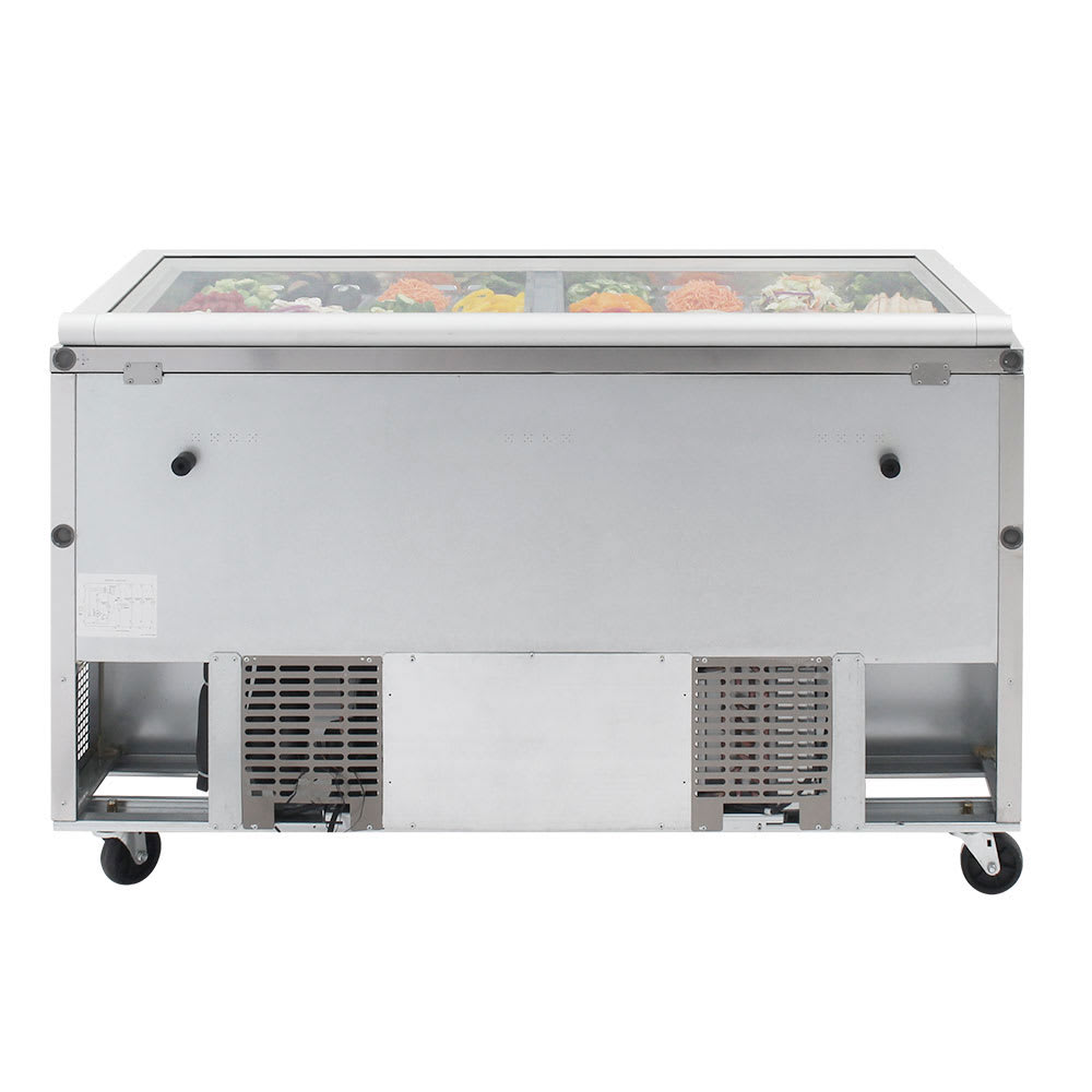 Super Deluxe Sandwich/Salad Mega Top Unit with Glass Lid, two-section, 19.0 cu. ft., stainless steel top with 24-pan opening, (2) stainless steel doors with recessed handles, ABS door liner, (2) stainless steel wire shelves, self-cleaning condenser equipped, cold air compartment, insulated pan cover, cutting board side rail, LED interior lighting & fan control, cold bunker system, self-contained rear mounted refrigeration system, R290 Hydrocarbon refrigerant, stainless steel interior & exterior (galvanized bottom), 1/5 HP, 115v/60/1-ph, 8.9 amps, NEMA 5-15P, ETL-Sanitation, cETLus, Made in USA