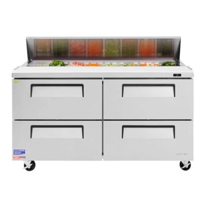 The Turbo Air TST-60SD-D4-N Super Deluxe prep table operates at a set temperature between 33 and 39 degrees Fahrenheit, and eco-friendly R290 hydrocarbon refrigerant maintains these temperatures. A corrosion-resistant coating on the evaporator lengthens its life, and the top compartment comes with 16 sixth-size, 4-inch-deep pans under its insulated pan cover. Equipped with a forced-air cooling system, this unit moves cold air around the food pans to keep contents under 41 degrees Fahrenheit.