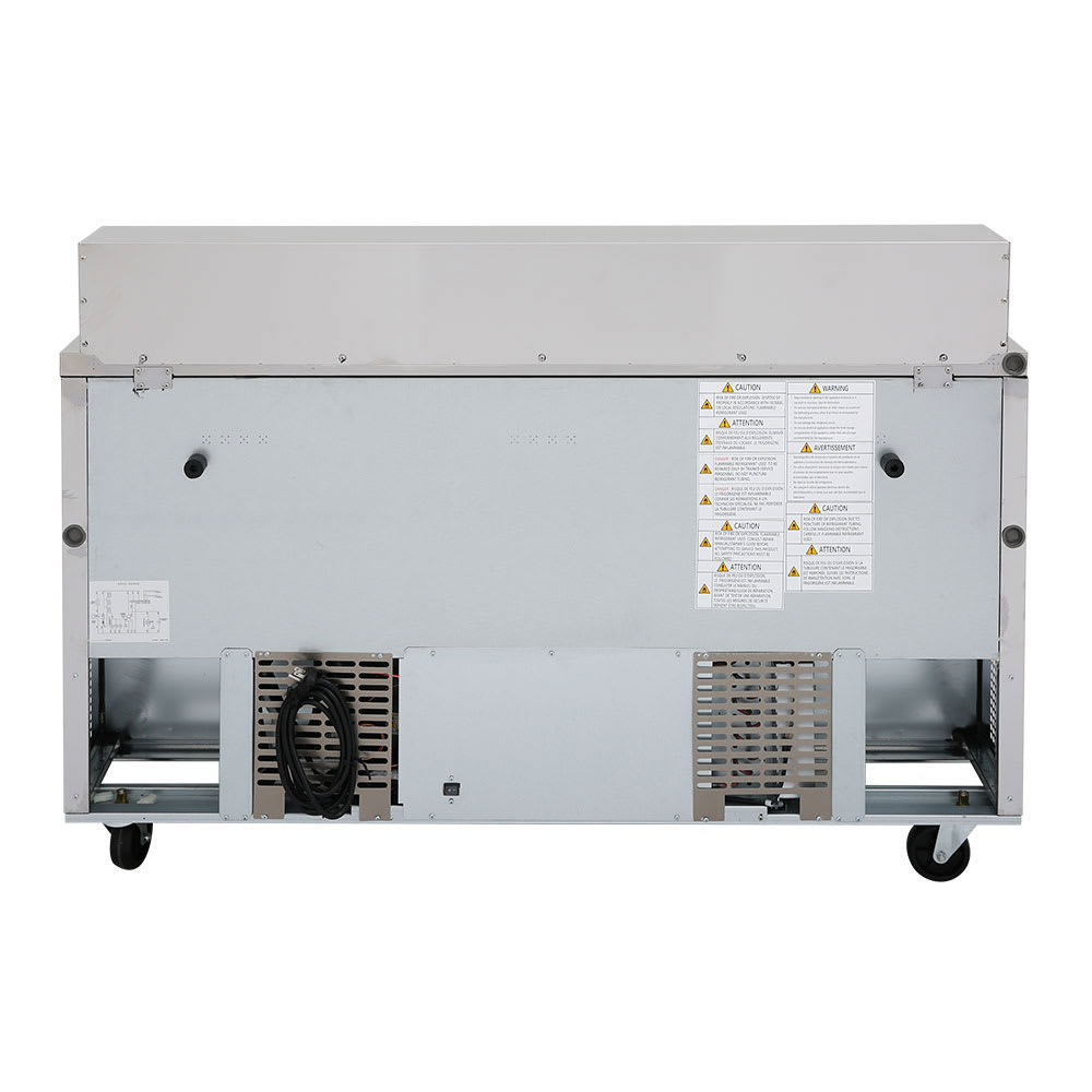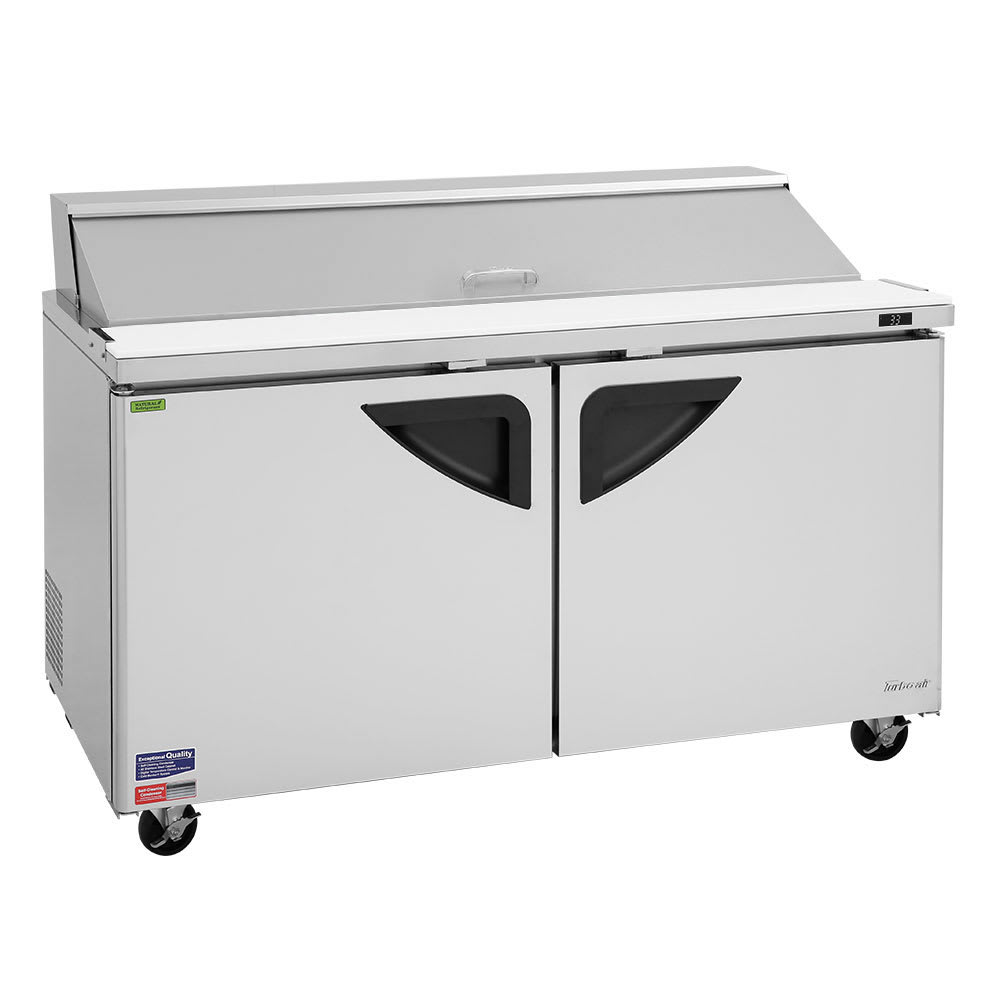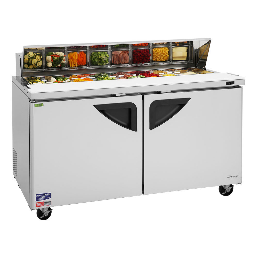 The Turbo Air TST-60SD-N prep table’s top compartment has 16 sixth-size pans that hold ingredients for salads and sandwiches in a convenient assembly area while forced air cools the compartment, keeping each side of the pans under 41 degrees Fahrenheit. Insulated to retain cold temperatures, a pan cover sits over the stored ingredients and reduces the risk of contamination. A 91/2-inch-deep cutting board spans across the front of the unit for prepping and assembling.