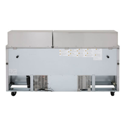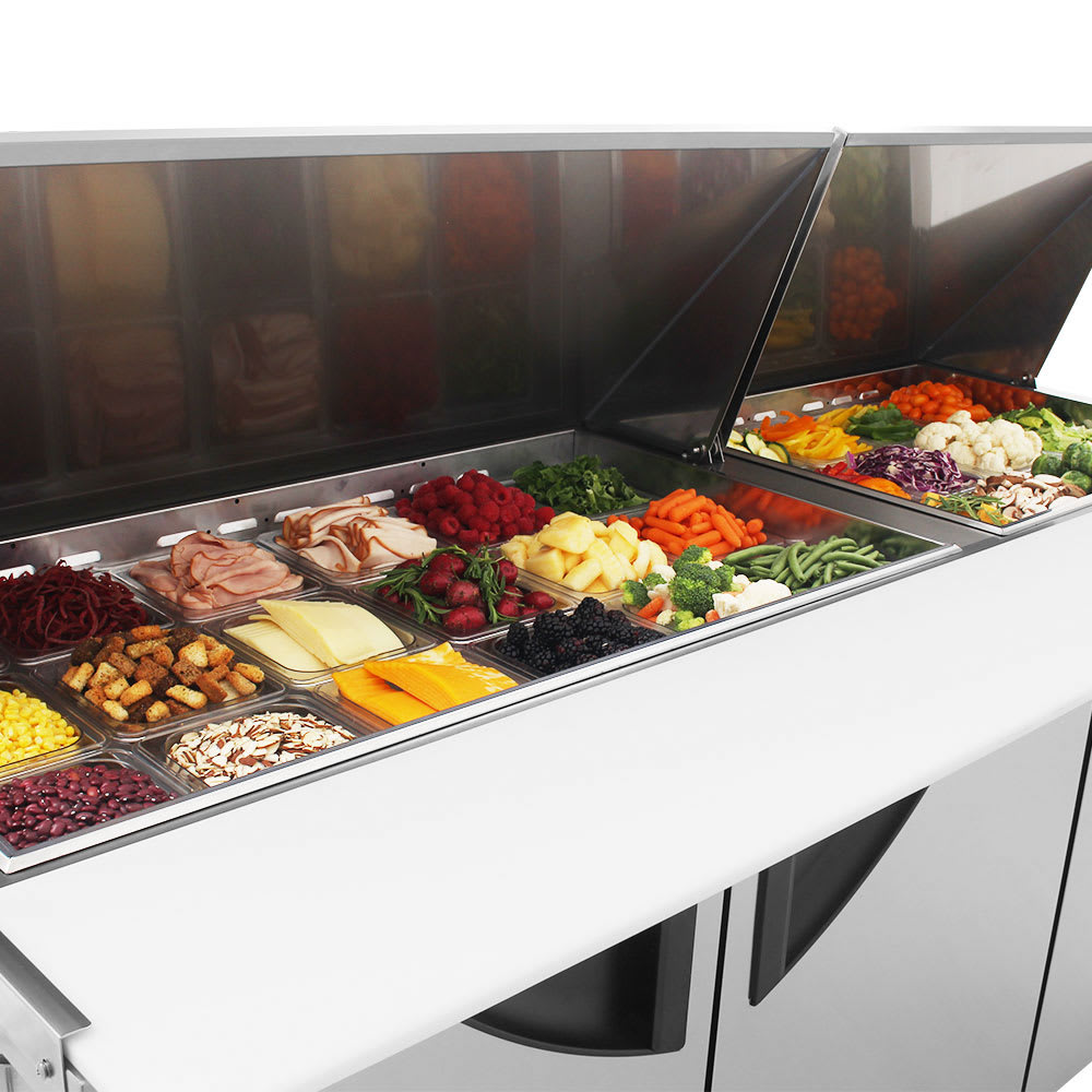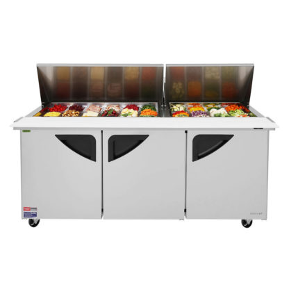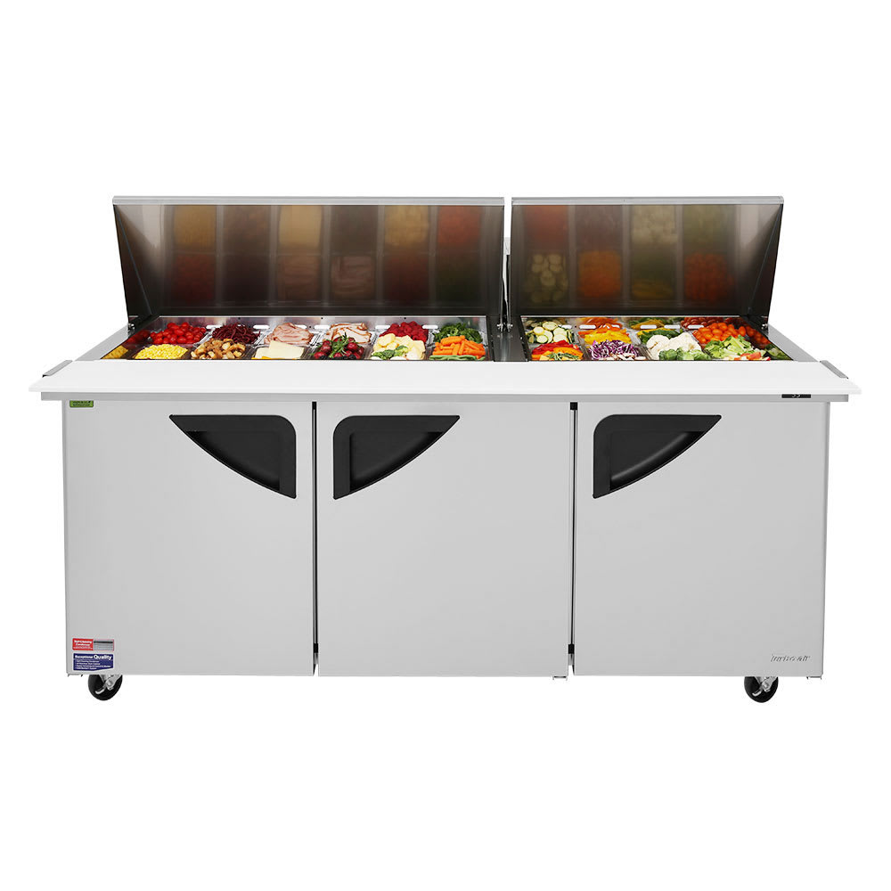 In its top section, the Turbo Air TST-72SD-30-N Super Deluxe prep table has 30 sixth-size, 4-inch-deep pans that are cooled by a forced-air system and protected from contaminants by insulated covers. On the full-length cutting board, staff members can prep ingredients and assemble salads or sandwiches. It has three doors, and a stainless steel shelf in each section holds product. The interior and exterior are constructed of durable stainless steel, and the interior is insulated with foamed-in-place polyurethane to maintain cold temperatures.
