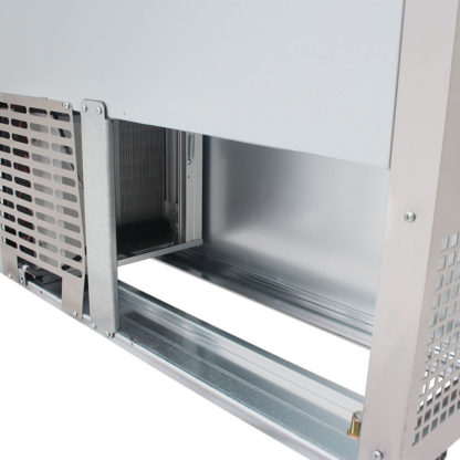 The Turbo Air TST-72SD-30-N prep table uses R290 hydrocarbon refrigerant to keep a set temperature between 33 and 39 degrees Fahrenheit. The straightforward digital control system aids in operation and enables the user to monitor the temperature. To prevent a system failure, a self-cleaning device keeps dirt and debris from collecting on the condenser, and the epoxy-coated evaporator is resistant to corrosion. A fan control feature keeps the cabinet cool by shutting off the fan when the door is open to prevent warm air from being pulled in.