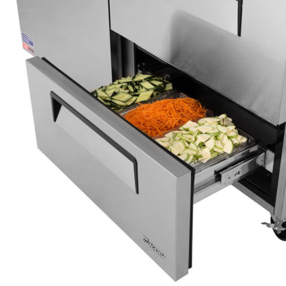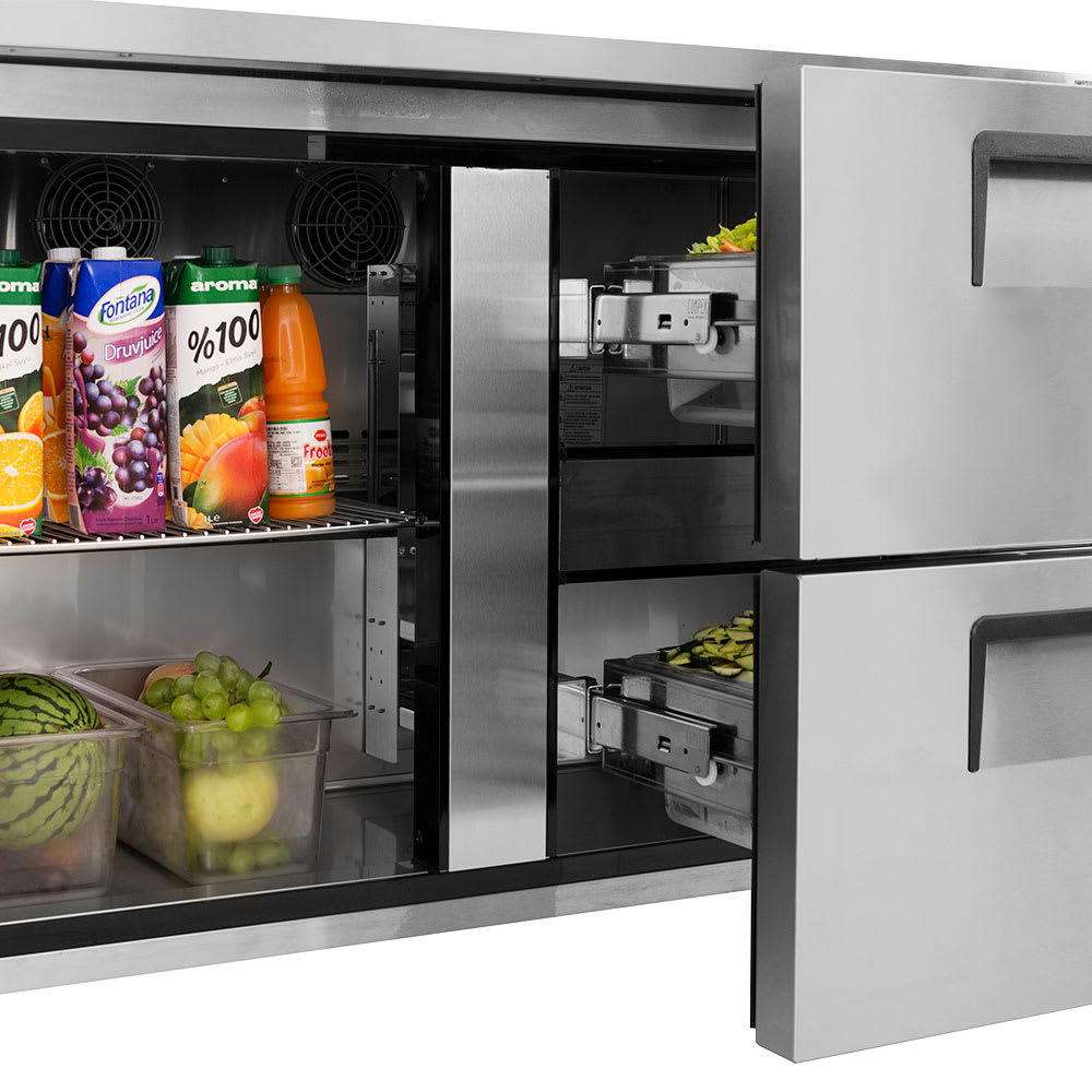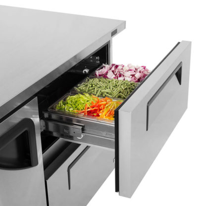 Built for heavy use in high-volume operations, the Turbo Air TUR-60SD-D2-N undercounter refrigerator is constructed of durable stainless steel. It features a rear-mounted, self-contained refrigeration system and uses eco-friendly R290 refrigerant. Using a reliable digital temperature control and monitoring system, the unit’s temperature can be adjusted between 33 and 38 degrees Fahrenheit.