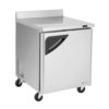 High-density polyurethane insulation foams the Turbo Air TWF-28SD-N Super Deluxe work top freezer’s cabinet structure and solid door in place; one-piece, magnetic door gaskets can be removed without tools to facilitate cleaning and replacement. For optimal product visibility, this unit has LED interior lighting, while operators can control its fan. This freezer preserves frozen food between -10 and 0 degrees Fahrenheit. It has 7 cubic feet of interior space and its overall dimensions are 271/2 inches wide, 31 inches deep, and 381/2 inches high.