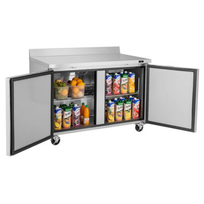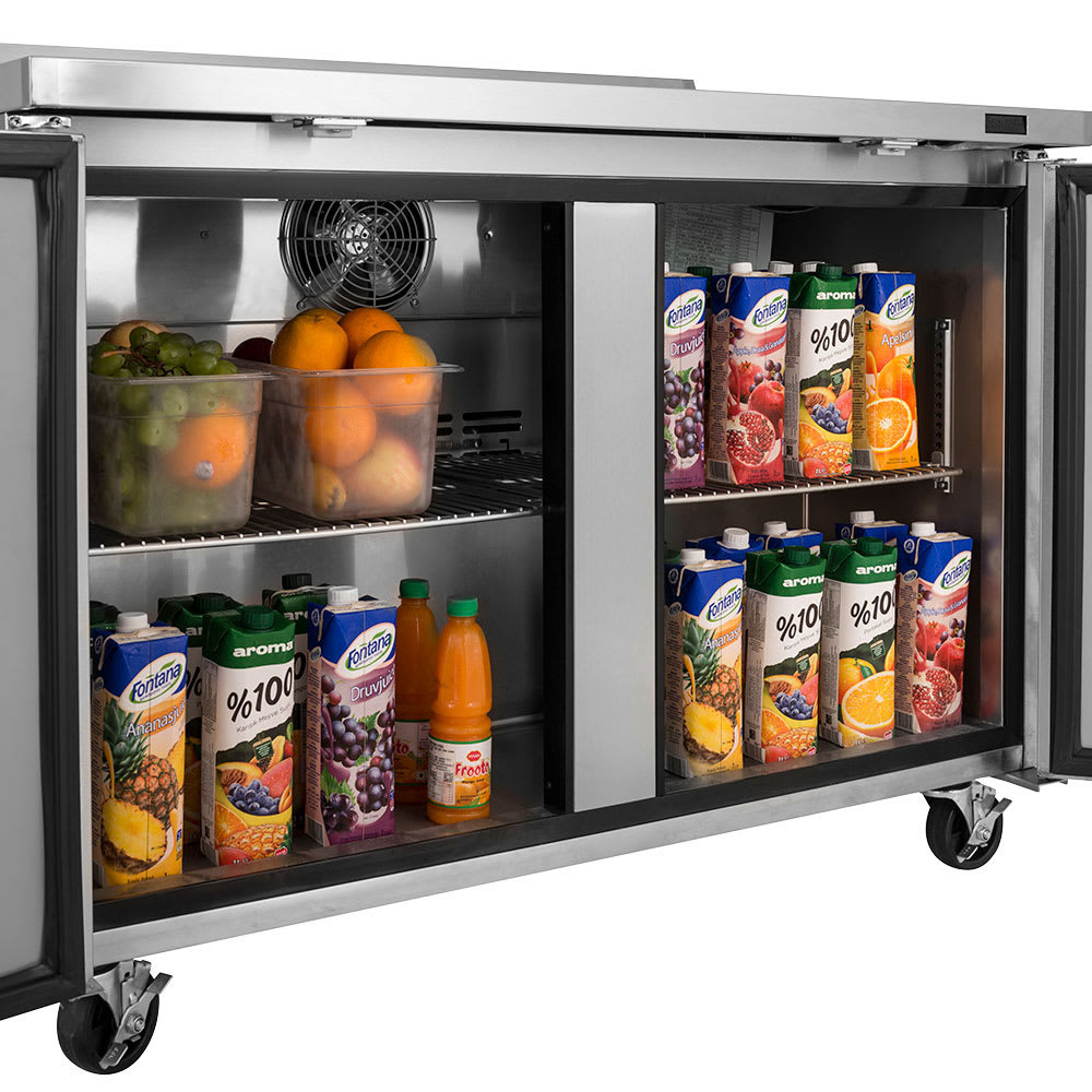 Super Deluxe Worktop Freezer, two-section, 12.0 cu. ft., self-cleaning condenser equipped, LED interior lighting, (2) stainless steel doors with recessed handles, stainless steel interior & exterior, ABS door liner, (2) stainless steel wire shelves, LED interior lighting, self-contained rear mounted refrigeration system, R290 Hydrocarbon refrigerant, 1/3 HP, 115v/60/1-ph, 2.4 amps, NEMA 5-15P, cETLus, ETL-Sanitation, ENERGY STAR®