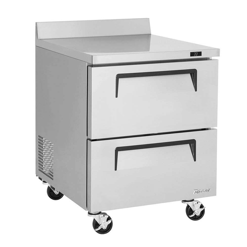 Constructed of dent- and rust-resistant stainless steel, the Turbo Air TWR-28SD-D2-N one-section refrigerator is well suited to rigorous use. Its single section offers 7 cubic feet of interior space, which can be accessed through its two drawers. For maneuvering, this unit is mounted on 4-inch swivel casters, and the front set is locking to secure it in place.