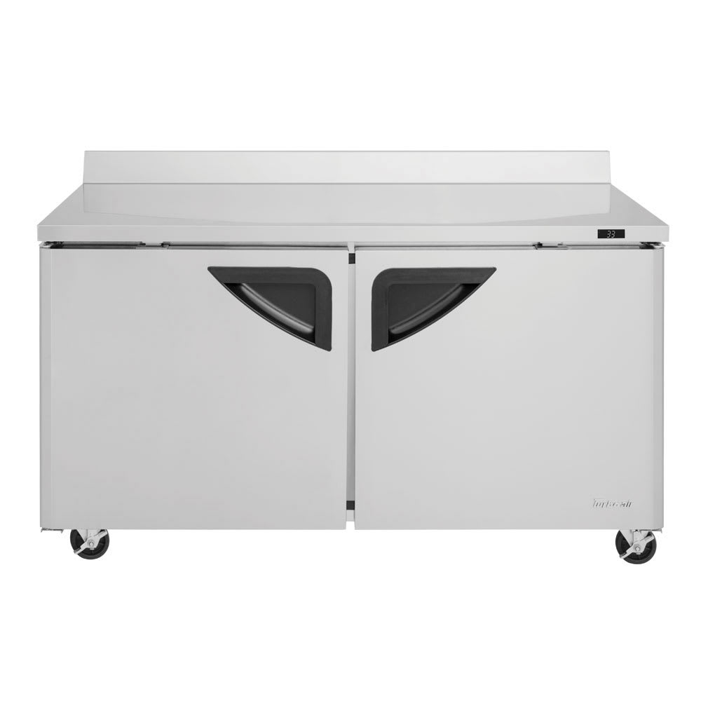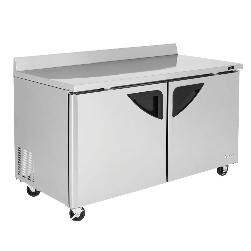 The Turbo Air TWR-60SD-N worktop refrigerator is ideal for prep areas since it holds product while ingredients can be prepared on the top. A backsplash on the rear contains spills, and its stainless steel construction eases cleaning. Magnetic gaskets around the openings of doors and polyurethane insulation retain cold air in the bottom. Both doors close by themselves to keep warm air of the cabinet, while the Turbo Air TWR-60SD-N worktop refrigerator has a cleaning device on the condenser that removes debris every day.