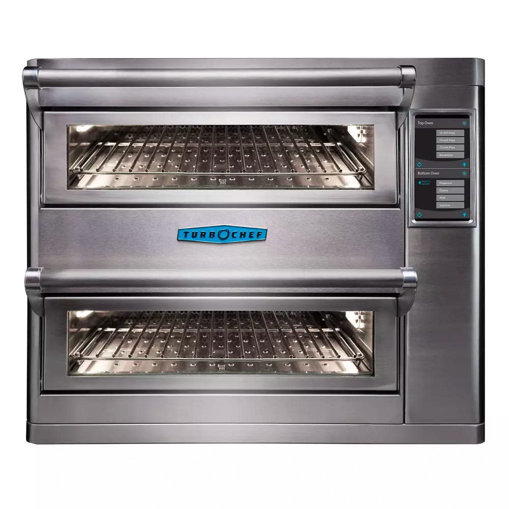 The TurboChef HHD-9500-14-DL double half-size convection oven has two decks with independent controls to cook two types of food at a time. Each deck can hold 400 preset recipe settings, adjustable with touch controls and read-outs in multiple languages. To remove guesswork from maintenance, self-diagnostics tell employees if something is wrong. This unit can be adjusted manually, with a USB drive, and via Wi-Fi.