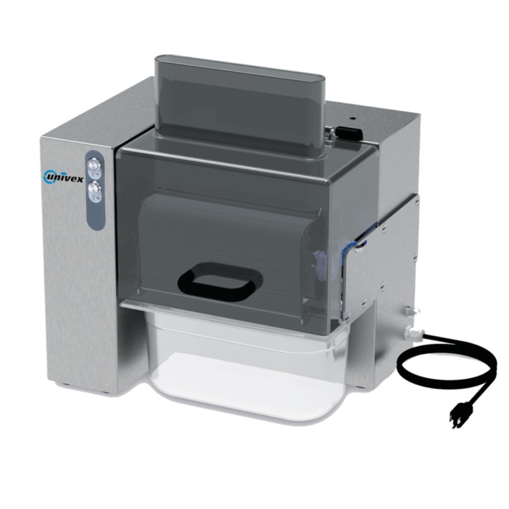 For safe operation, the Univex MT975 countertop meat tenderizer includes a transparent safety cover that is interlocked to shut off automatically when it’s removed. To facilitate thorough sanitation, the cradle assembly is easily removable. With a stainless steel construction, this unit is durable for high-volume use and won’t rust, corrode, or warp over time.