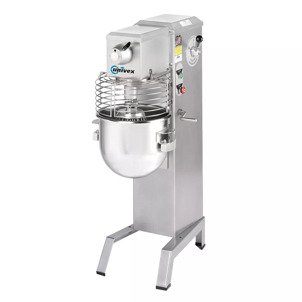 Because the Univex SRMF20 planetary mixer comes with a dough hook, batter beater, and wire whip, it can mix a variety of doughs and batters, and its No. 12 hub can accept other attachments, which are sold separately. The variable speed drive enables it to operate at any speed within its range or at the four preset speeds for efficient use. While mixing, ingredients can be added through the chute, and the speed can be adjusted without stopping. Interlock switches disable operation if the safety guard is open or the bowl is lowered, protecting the user from injury. The Univex SRMF20+ planetary mixer features a heavy-duty, 20-quart stainless steel bowl, and its two-piece safety guard is dishwasher safe.