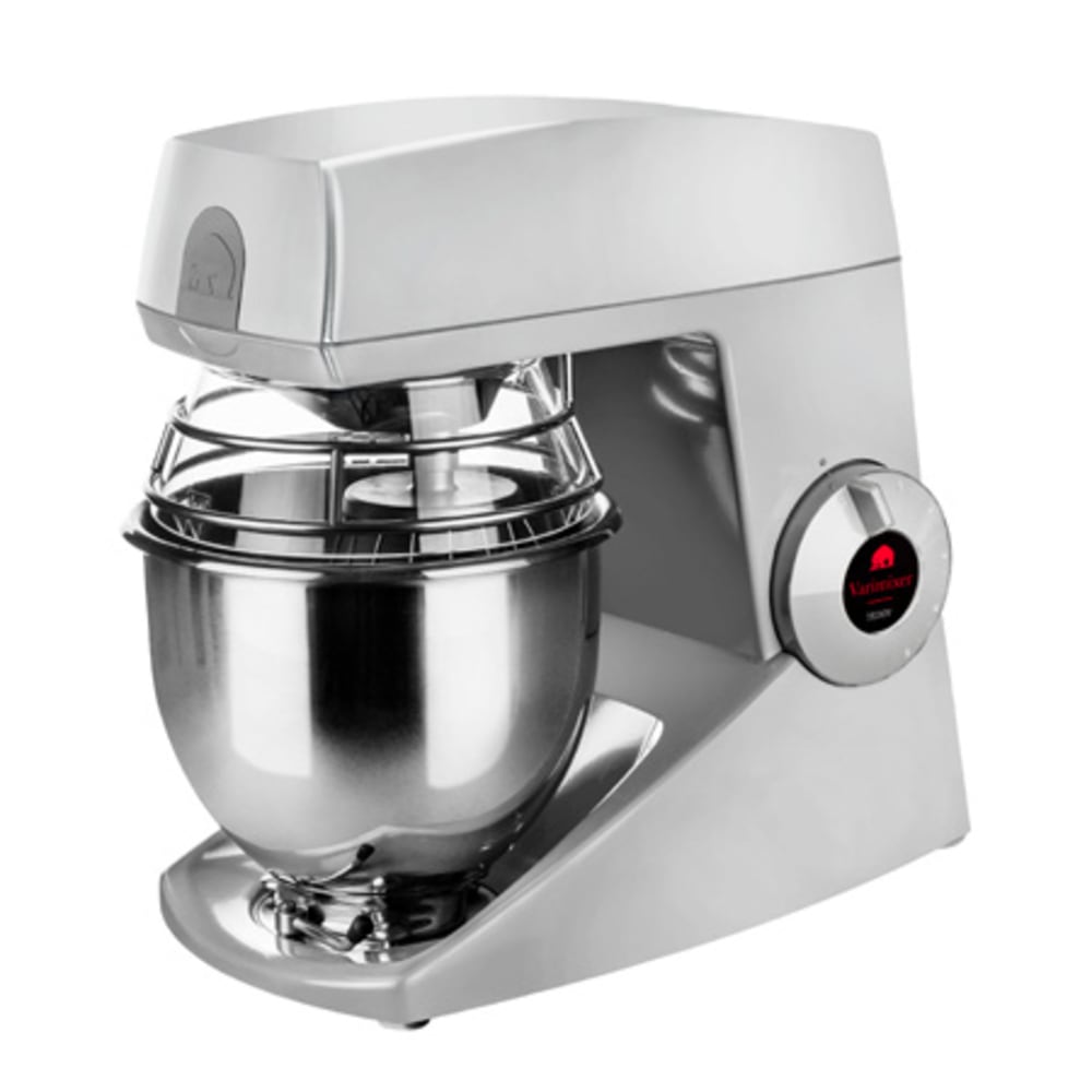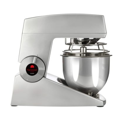 Measuring 9.5 inches wide by 21.66 inches deep by 15.75 inches high, the Varimixer V5-S planetary mixer comes with the provisions to be mounted on a countertop or table. Constructed of aluminum, it features a silver powder-coated finish to match common color schemes. Its 5-quart bowl is secured in place with a bowl clamp, and the stainless steel bowl guard enables users to easily add ingredients. To support various cooking methods, this machine includes a dough hook, wire whip, flat beater, and a steel bowl-all made of stainless steel. An ingredient chute and a polycarbonate bowl shield are also included with purchase.