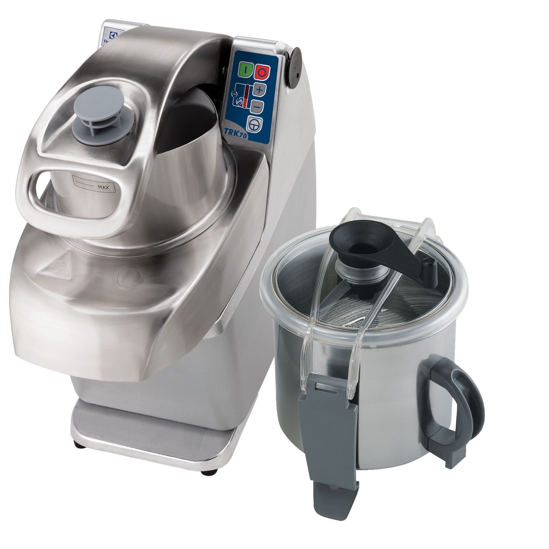 Magnetic safety system and motor brake. Prevents machine from running when vegetable preparation lever and/or hopper are lifted or when cutter lid is not properly closed.