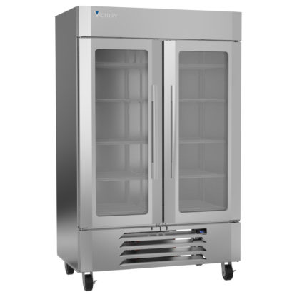 UltaSpec Series Merchandiser Refrigerator, Reach-in, two-section, self-contained refrigeration, 46.15 cu. ft. capacity, (2) full height hinged glass doors, (5) epoxy coated shelves per door section, stainless steel exterior, aluminum interior, standard depth cabinet, electronic LED lighting, expansion valve technology, Magnetic door gasket with 2 year warranty, stainless steel breakers, bottom mounted compressor, 1/3 HP, cULus, UL EPH Classified, UL-Sanitation, MADE IN USA.