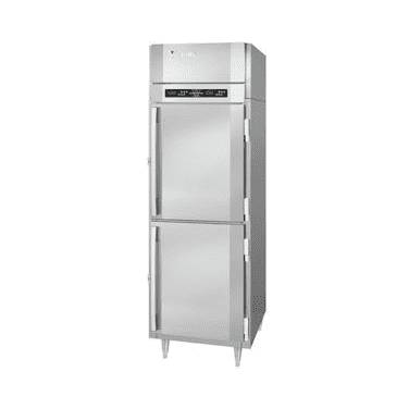 UltraSpec Series Refrigerator, Reach-in, one-section, self-contained refrigeration, 24.08 cu. ft. capacity, (2) wide half height solid hinged doors, (3) silver freeze (chrome-style) shelves, stainless steel exterior & interior, standard depth cabinet, TOUCH POINT electronic temperature control/indicator, LED lighting, expansion valve technology, Santoprene door gaskets with 2 year warranty, stainless steel breakers, 1/3 HP, cULus, UL EPH Classified, UL-Sanitation, MADE IN USA.