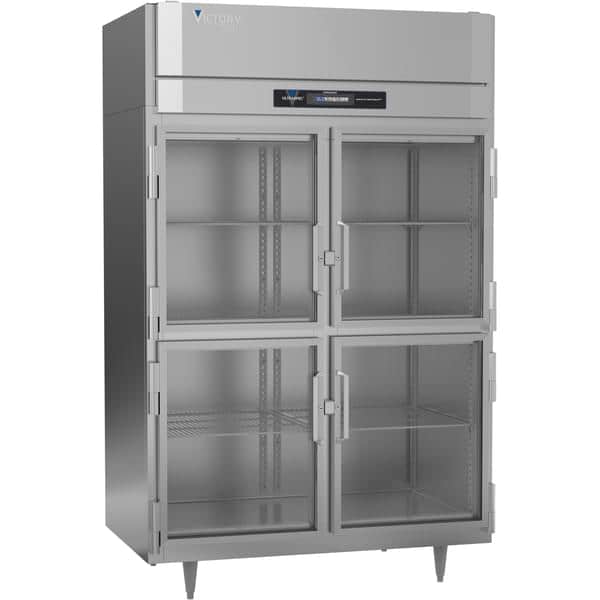 UltraSpec Series Refrigerator, Reach-in, two-section, self-contained refrigeration, 44.57 cu. ft. capacity, (4) half height hinged glass doors, (6) silver freeze (chrome-style) shelves, stainless steel exterior & interior, standard depth cabinet, TOUCH POINT electronic temperature control/indicator, LED lighting, expansion valve technology, Santoprene door gaskets with 2 year warranty, stainless steel breakers, 1/3 HP, cULus, UL EPH Classified, UL-Sanitation, MADE IN USA