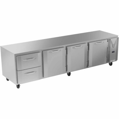 One section of this Undercounter Refrigerator has a top and bottom drawer, each with heavy-duty pan guides that can fit up to 6″ deep pans. These drawers feature telescoping slides that create a smooth sliding action to provide access from the front to the back of each drawer. The other three sections have doors with a total of six (6) epoxy-coated wire shelves that you can use to fit larger bulks of items. These drawers and doors are all self-closing, but they also have a stay-open design that makes the process of product loading more manageable.
