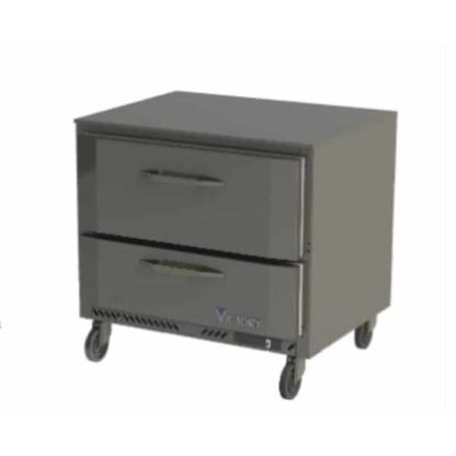 Undercounter Refrigerator, one-section, 36″W, rear mounted self-contained refrigeration, 8.5 cubic feet capacity, (2) drawers with telescoping slides & locking mechanism (accommodates 4″ or 6″ deep pans – not included), full electronic control, 1/2″ thick stainless steel top, stainless steel front & sides, aluminum interior, Santoprene gaskets with 2 year warranty, R290 Hydrocarbon refrigerant, 1/6 HP, UL-Sanitation, cULus, UL EPH Classified, MADE IN USA